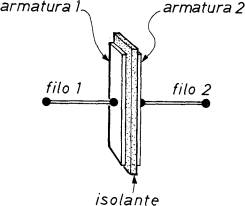 Fig. 4 - Se le superfici delle due armature del condensatore sono di misura ridotta, la capacità del condensatore è piccola. I due conduttori, filo i e filo 2, sono elettricamente collegati con le due armature.