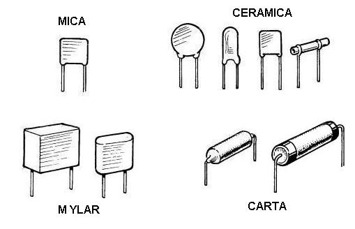 Fig. 6 - Esempi di condensatori di vario tipo attualmente reperibili in commercio e comunemente montati sui circuiti elettronici. I valori capacitivi più bassi sono propri dei condensatori a mica, quelli più alti si trovano nei modelli a carta.