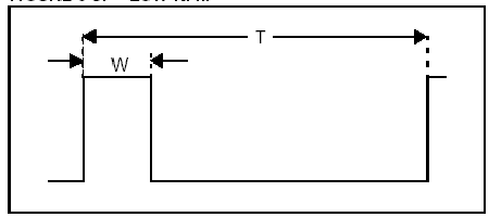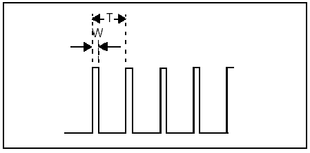 Figura 11: alto RPM Queste figure mostrano le differenze nelle forme d'onda quando varia il valore del RPM. Da notare che quando lo RPM aumenta, il periodo T e la larghezza dell'impulso W diventano più piccoli. Entrambi periodo e larghezza sono proporzionali al valore di RPM. Comunque dato che il periodo e' più grande della larghezza W si e' soliti misurare il periodo in modo da avere una maggiore risoluzione. In tal caso si può usare i metodi visti in TIP1 o TIP2 per la misura del periodo |