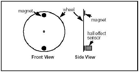 Figura 9: sensori ad effetto HALL In Figura 10 e Figure 11, sono riportate le forme d'onda all'uscita dei sensori rispettivamente nel caso di basso e alto RPM. Il segnale in uscita e' alto quando, nel caso del sensore ottico, questo e' investito dal fascio luminoso che passa attraverso la fessura della ruota.Nel caso del sensore ad effetto Hall, l valore alto si manifesta quando il magnete e' affacciato in corrispondenza con il sensore